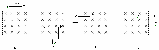 10. 粗细均匀的电阻丝围成的正方形线框置于有界匀强磁场中,磁场方向垂直于线框平面,其边界与正方形线框的边平行。现使线框以同样大小的速度沿四个不同方向平移出磁场,如图所示,则在移出过程中线框一边a、b两点间的电势差绝对值最大的是 ( )