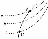 如图所示,虚线a、b、c代表电场中三个等势面,相邻等势面之间的电势差相等,即Uab = Ubc,实线为一带正电的质点仅在电场力作用下通过该区域时的运动轨迹,P、Q是这条轨迹上的两点,据此可知