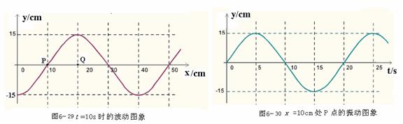 14.(8分)图6-29为某波动在t =10s时的图像,图6-30为图1中x =10cm处P点的振动图像。根据图示信息回答下列问题。