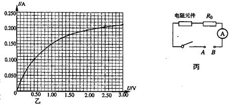 ①电阻元件的电阻随电压U的变大而 (填“变大”、“变小”或“不变”);②若把电阻元件接入如图丙所示的电路中时,电流表的读数为0.070A,已知A、B两端电压恒为1.5V,则定值电阻R0阻值为 Ω。(结果保留两位有效数字)