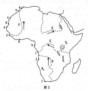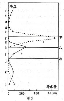 图2中a一1表示非洲西海岸地带的城市。图3中折线1、2表示这些城市1月与7月的降水量分布,甲、乙和丙中的某一条直线表示赤道。据此回答2-4题。