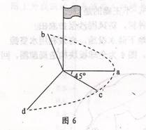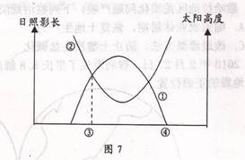 图6是冬至日南半球某地旗杆影子轨迹示意图。a、b、c、d表示不同时刻的影长,b、d影长为一天中的最大值,a与b、a与d两线间的夹角都是112。30,,a与c之间的夹角为45。,虚曲线为杆影端点的轨迹,该旗帜一年四季总是随风飘向东南。图7是冬至日旗杆影长和该日太阳高度示意图。据此回答9-11题。