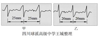 (石景山区)15. 心电图仪(如右图所示)通过一系列的传感手段,可将与人心跳对应的生物电流情况记录在匀速运动的坐标纸上.医生通过心电图,可以了解到被检者心跳的情况,例如,测量相邻两波峰的时间间隔,便可计算出1 min内心脏跳动的次数(即心率).同一台心电图仪正常工作时测得待检者甲、乙的心电图分别如图甲、乙所示.若医生测量时记下被检者甲的心率为60次/ min,则可推知乙的心率和这台心电图仪输出坐标纸的走纸速度大小分别为