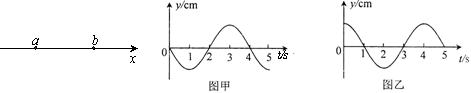 如下图所示,一列简谐横波在x轴上传播,图甲和图乙分别为x轴上a、b两质点的振动图象,且
