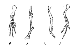 下左图A、B、C、D四个器官中,其中不属于同源器官的是( )