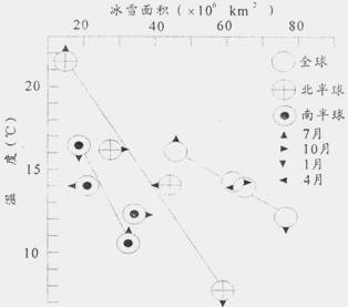 读地球温度变化与冰雪面积关系示意图,回答1-2题。