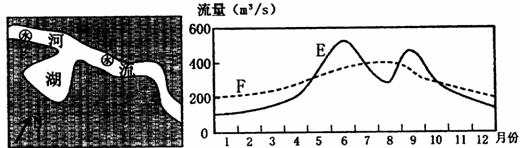 图 5 中,左图示意我国东部河流某河段,右图示意左图中河流 E 、 F 两水文站浏的多年平均流量变化。读图完成 9-10 题。