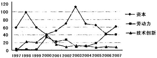 ( 4 )结合材料 2 描述江苏 1997--2007年资本、劳动力、技术创新等因素对经济增长贡献率的变化特征和差异 。( 3 分)