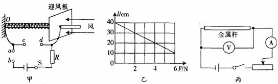 31.(8分)小明、小亮和小敏共同设计了一种测定水平方向风力的装置,其原理如图甲所示.绝缘轻弹簧的左端固定在O点,右端与中心有孔、表面竖直的金属迎风板相连,一起套在左端固定在O点的粗细均匀、电阻随长度均匀变化的水平金属杆上,迎风板与金属杆接触良好.电路中左端导线与金属杆的左端相连,右端导线连接在迎风板上并可随迎风板一起移动,R是定值电阻,a、b、c、d为四个接线柱.