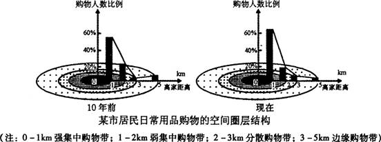 图9示意某市居民10年前和现在购买日常生活用品的空间变化,读图回答20--21题。