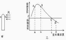 29.如图所示,甲图表示胚芽鞘受到单侧光的照射,乙图表示不同浓度生长素溶液对胚芽鞘生长的影响,如果甲图中b处的生长素浓度为m,设a处的