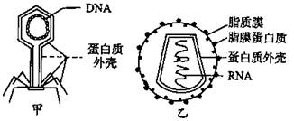 4.右图甲为噬菌体(T2),乙为艾滋病毒结构模式图。下列说法错误的是 ( )