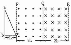 如图所示,在PQ、QR区域中存在着磁感应强度大小相等、方向相反的匀强磁场,磁场方向均垂直于纸面.一直角三角形闭合导线框abc位于纸面内,框的ab边与bc边互相垂直.导线框与磁场区域的尺寸如图所示.从t=0时刻开始,线框匀速穿过两个磁场区域,速度方向与bc边平行,并垂直于磁场边界.以逆时针方向为线框中电流i的正方向,以下四个i-t关系示意图中正确的是: