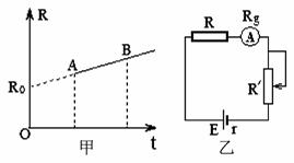 23.(12分)如图甲所示某电阻R随摄氏温度t变化的关系,图中R0表示0℃时的电阻,k表示图线的斜率,若用该电阻与电池(E、r)、电流表Rg、滑动变阻器R′串连起来,连接成如图乙所示的电路,用该电阻做测温探头,把电流表的电流刻度改为相应的温度刻度,于是就得到了一个简单的“电阻测温计”。