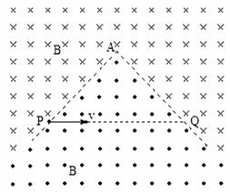 (21分)如图所示,空间某平面内有一条折线是磁场的分界线,在折线的两侧分布着方向相反、与平面垂直的匀强磁场,磁感应强度大小都为B。折线的顶角∠A=90°,P、Q是折线上的两点,AP=AQ=L。现有一质量为m、电荷量为q的带负电微粒从P点沿PQ方向射出,不计微粒的重力。