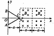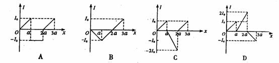 20.如右图所示,两个垂直纸面的匀强磁场方向相反,磁感应强度的大小均为B,磁场区域的宽度均为a,一正三角形(高为a)导线框ABC从图示位置沿图示方向匀速穿过两磁场区域,以逆时针方向为电流的正方向,在下图中感应电流I与线框移动距离x的关系图象正确的是C