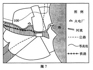 读“我国某海滨小城功能区分布示意图”(图7),完成14-16题。