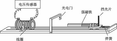 (2) 某学习小组的学生利用线圈、强磁铁、光电门传感器、电压传感器等器材,研究“线圈中感应电动势大小与磁通量变化快慢的关系”。在探究线圈感应电动势E 与时间△t的关系时,他们把线圈和光电门传感器固定在水平光滑轨道上,强磁铁和挡光片固定在运动的小车上,实验装置如图所示。当小车在轨道上运动经过光电门时,光电门会记录下挡光片的挡光时间△t,同时小车上的强磁铁插入线圈中,接在线圈两端的电压传感器记录线圈中产生的感应电动势E的大小(E近似看成恒定)。调节小车末端的弹簧,小车能够以不同的速度从轨道的最右端弹出。下表是小组同学进行多次测量得到的一系列感应电动势E和挡光时间△t。