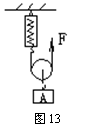 如图13所示,绳的一端通过弹簧秤固定,当人对绳的拉力F是60N时,可使物体A匀速上升,若不计摩擦,弹簧秤的示数是_________N;若滑轮重20N,则物体A重________N。若重物A上升的速度为0.5m/s,则拉力F上升的速度是___________m/s。