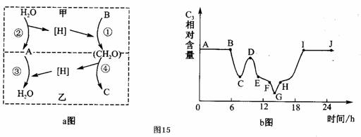 26.(10分)图15中a图表示高等植物细胞的两个重要生理过程中C、H、O的变化,b图表示一株小麦叶片细胞内C3相对含量在一天24小时内的变化过程。请据图回答: