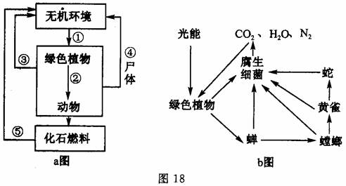 29.(10分)在2009年12月7日-18日召开的哥本哈根世界气候大会上,来自192个国家的谈判代表召开峰会,商讨《京都议定书》一期承诺到期后的后续方案,即2012年至2020年的全球CO2减排协议。图18中a图为碳循环示意图,b图表示生态系统各有关成分之间的关系。请据图回答: