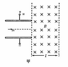 (13分)如图甲所示,偏转电场的两个平行极板水平放置,板长L=0.08m,板距足够大,两板的右侧有水平宽度l=0.06m、竖直宽度足够大的有界匀强磁场.一个比荷为