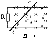 如图4,平行导轨间距为d,一端跨接一个电阻为R,磁场的磁感强度为B,方向与导轨所在平面垂直。一根足够长的金属棒与导轨成θ角放置,金属棒与导轨的电阻不计。当金属棒沿垂直于棒的方向以速度v滑行时,通过电阻R的电流强度是( )