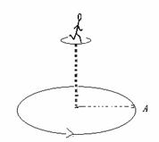 (8分)在第十一届全民运动会前夕,山东电视台组织了一个群众游乐项目,如图所示有一个半径为6m的匀速转动大圆盘,在圆盘中心正上方5m高处,有一小平台,(平台大小不计).游戏规则是,当圆盘上的A点转到运动员的正前方时,运动员从平台上水平跳向圆盘边缘的A点,若运动员恰好落在A点即获得成功.小明在游戏中有幸获得成功,(g=10m/s2)试求