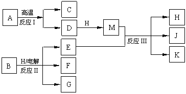26.(10西城零模)(14分)下图所示反应I、反应II和反应III均是工业生产中常见的反应。其中A、B为化合物,C是温室气体之一,D和K均可用做干燥剂,H常温下为液态化合物,J是一种具有漂白作用的盐,反应III和E与G反应的原理相同。