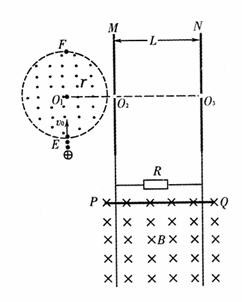 25.(18分)如图所示,半径为r、圆心为O1的虚线所围的圆形区域内存在垂直纸面向外的匀强磁场,在磁场右侧有一坚直放置的平行金属板M和N,两板间距离为L,在MN板中央各有一个小孔O2、O3,O1、O2、O3在同一水平直线上,与平行金属板相接的是两条竖直放置间距为L的足够长的光滑金属导轨,导体棒PQ与导轨接触良好,与阻值为R的电阻形成闭合回路(导轨与导体棒的电阻不计),该回路处在磁感应强度大小为B,方向垂直纸面向里的匀强磁场中,整个装置处在真空室中,有一束电荷量为+q、质量为m的粒子流(重力不计),以速率v0从圆形磁场边界上的最低点E沿半径方向射入圆形磁场区域,最后从小孔O3射出。现释放导体棒PQ,其下滑h后开始匀速运动,此后粒子恰好不能从O3射出,而从圆形磁场的最高点F射出。求:![]()