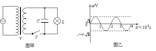 17. 一交流电路如图甲所示,T为理想变压器,原副线圈的变压比为11:1,C为电容器,灯泡L的电阻为20Ω。交流电源输出的电压u随时间t变化的图线如图乙所示,闭合开关S后