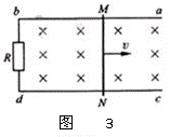 如图3所示,两根相距为l的平行直导轨ab、cd、b、d间连有一固定电阻R,导轨电阻可忽略不计。MN为放在ab和cd上的一导体杆,与ab垂直,其电阻也为R。整个装置处于匀强磁场中,磁感应强度的大小为B,磁场方向垂直于导轨所在平面(指向图中纸面内)。现对MN施力使它沿导轨方向以速度v(如图3)做匀速运动。令U表示MN两端电压的大小,则( )