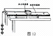 15、(10分)某实验小组利用拉力传感器和速度传感器探究“动能定理”,如图12,他们将拉力传感器固定在小车上,用不可伸长的细线将其通过一个定滑轮与钩码相连,用拉力传感器记录小车受到拉力的大小。在水平桌面上相距50.0cm的A、B两点各安装一个速度传感器记录小车通过A、B时的速度大小。小车中可以放置砝码。