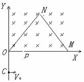 (14分)如图,空间XOY的第一象限存在垂直XOY平面向里的匀强磁场,第四象限存在平行该平面的匀强电场(图中未画出);OMN是一绝缘弹性材料制成的等边三角形框架,边长L为4m,OM边上的P处开有一个小孔,OP距离为1m。现有一质量m为1×10-18kg,电量q为1×10-15C的带电微粒(重力不计)从Y轴上的C点以速度V0=1×102m/s平行X轴射入,刚好可以垂直X轴从P点进入框架,CO距离为2m。粒子进入框架后与框架发生若干次垂直的弹性碰撞,碰撞过程中粒子的电量和速度大小均保持不变,速度方向与碰前相反,最后粒子又从P点垂直X轴射出,求: