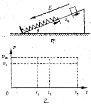 (3)从滑块静止释放瞬间开始计时,请在乙图中画出滑块在沿斜面向下运动的整个过程中速度与时间关系v-t图象。图中横坐标轴上的t1、t2及t3分别表示滑块第一次与弹簧上端接触、第一次速度达到最大值及第一次速度减为零的时刻,纵坐标轴上的v1为滑块在t1时刻的速度大小,vm是题中所指的物理量。 ( 本小题不要求写出计算过程 )