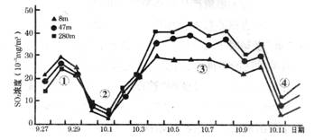 据某时期内我国北方某地上空不同高度SO2浓度变化图判断,期间可能出现冷空气入侵的两个时段是