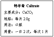 (2) (6分) 钙是维持人体正常功能所必需的元素。下图所示为某种补钙剂“钙尔奇”说明书的一部分。取1片钙尔奇,放入盛有适量稀盐酸的烧杯中,其中的碳酸钙跟盐酸完全反应(其他成分与盐酸不反应)。