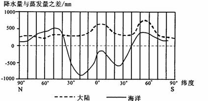 读“地球上大陆和海洋各纬度带的水平衡(降水量减去蒸发量)图”,结合所学知识,回答3-4题。