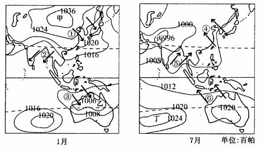 读“世界某区域1月和7月海平面气压和风图”,①-⑥处的箭头表示风向,据此回答7-8题。