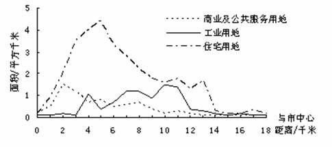 下图为“我国某城市主要功能用地面积空间变化图”。完成13-14题。