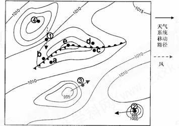 5.图中abcde五地,最有可能出现降水的是