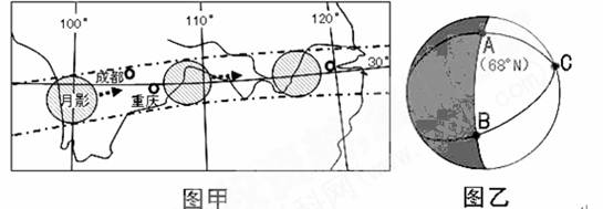 材料一:2009年7月22日,我国出现了罕见的日全食天象,日、月、地三者位于同一直线,月影刚好投影在地球表面,并且自西向东扫过长江流域,形成日全食观察带(如图甲所示)。位于月影区的人们能够观测到日全食。