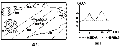 读图10“我国西南部地区某村镇旅游资源分布示意图”以及图11“该地区旅游接待能力与市场需求关系图”,回答下列问题。