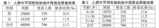 7.地中海贫血是我国南方最常见的遗传性血液疾病之一,为了解南方某城市人群中地中海贫血的发病情况,某研究小组对该城市的68000人进行了调查,调查结果如下表。下列说法正确的是