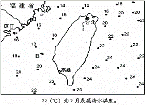 (1)根据图中表层海水的温度,说明台湾岛东西两侧海水温度的差异及原因。(4分)