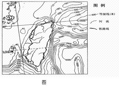 (2)简要分析图示区域东西两侧海水深度差异较大的原因。指出台湾岛河流的突出特征及开发利用方向。(10分)