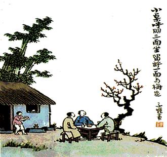 26.观察下面的漫画,选角度,写一段鉴赏文字。不超过60字。(画面所题诗句为“小桌呼朋三面坐,留将一面与梅花”)(5分)