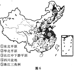 9.甲、乙、丙自然带分别为 A.亚热带常绿硬叶林带、热带草原带、热带雨林带 B.热带荒漠带、热带草原带、亚热带常绿硬叶林带 C.热带雨林带、热带草原带、亚热带常绿阔叶林带 D.热带草原带、亚热带常绿阔叶林带、热带荒漠带 10.乙自然带在图示区域的分布主要体现了 A.经度地带分异规律 B.垂直地带分异规律 C.纬度地带分异规律 D.非地带性分异规律 读“我国耕地集中分布区图”(图6),完成11-13题