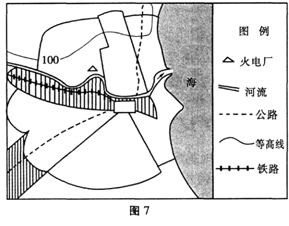 读“我国某海滨小城功能区分布示意图”(图7),完成14-16题。