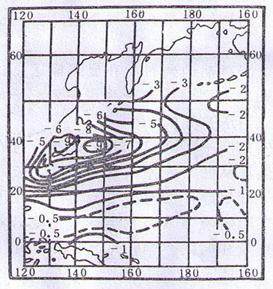 读“西北太平洋某季节气温与海水温度的差数分布”图,回答6-8题。